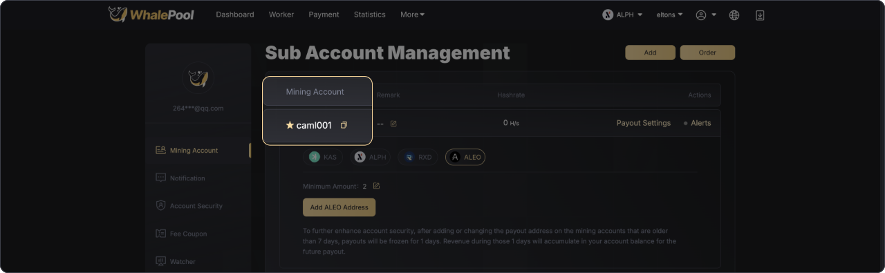 Visit the official WhalePool website and follow the instructions to complete registration. After logging into your account, go to the "Mining Account" section and copy your account name to configure mining parameters.