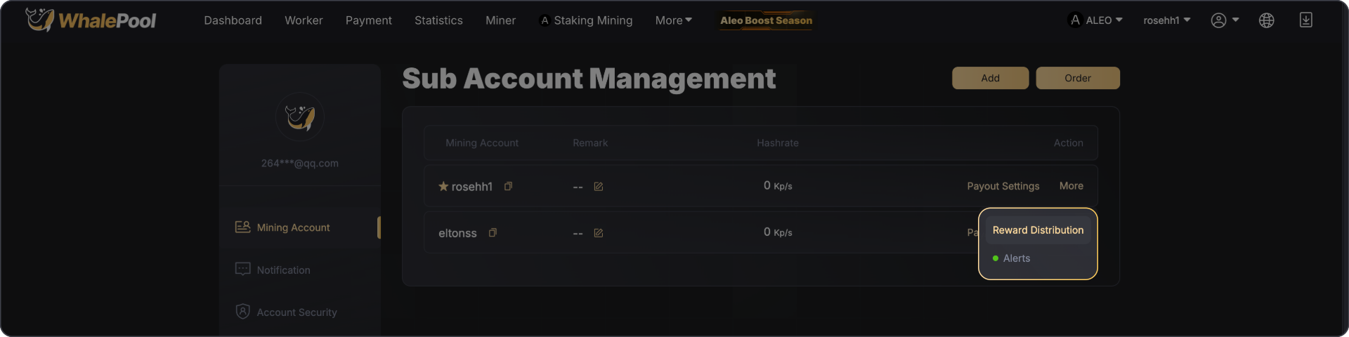After logging in, locate the sub-account under the mining account. Click [More] and select [Revenue Distribution] to enter the main operation page.