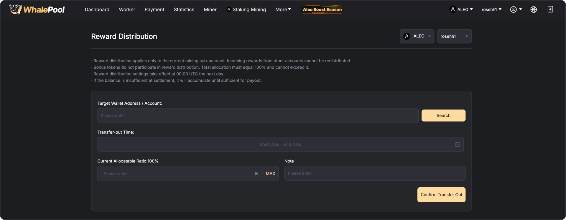 · Revenue distribution applies only to the current mining sub-account. Incoming earnings from other accounts cannot be redistributed.